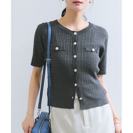 上品な印象を与える金ボタンが並ぶ、半袖ニットカーディガン。