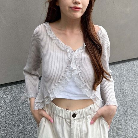 繊細なレーストリミングが女性らしさを引き立てる、クロップド丈のカーディガン。