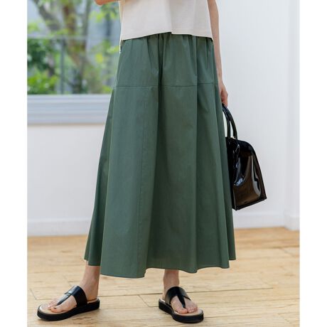 生地をたっぷりと使った分量感のあるギャザースカート。後ろに向けて切り替えをラウンドさせ、雰囲気のあるデザインにしています。撥水性や接触冷感の機能性を持った素材を使用しているため、夏にぴったりのアイテムです。カラーは、爽やかな青味を感じるセージグリーン(#053)、カジュアルすぎず涼やかなベージュ(#033)、シックな雰囲気が漂うブラック(#005)の3色展開です。