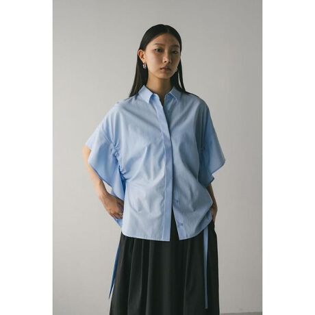 モデル身長172cm(FREEサイズ着用)袖のリボンの調整で雰囲気変化を楽しめるルーズシルエットシャツ。紐を垂らしたモードなスクエアシルエットと、ドロストしてギャザーフレアシルエットで動きを出すこともできる2WAYデザイン。ゆったりとしたサイジングで抜け感のある一枚です。アーム部分にはマチを入れているのでインナーを気にせず着用していただけます。透け感WHTややあり、ストレッチなし。【お手入れ方法】マシンウォッシュ可
