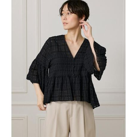 ■デザインチェック柄のシアーな素材感が印象的なペプラムブラウス。深めのVネックで襟元をすっきりさせ、裾と袖口にはたっぷりのギャザーでバランスの取れたデザインに仕上げました。カジュアルにデニム合わせや、キレイ目パンツスタイル合わせにもおすすめです。インナーにキャミを合わせてブラウスとしてはもちろん、ワンピースの羽織りとしても使用出来き、コーディネートにアクセントをプラスしてくれるアイテムです。■素材サッカー調のシアーチェック素材。とても軽く、エアリーな手持ち感とサッカー地の様なナチュラルなシボ、透け感と凹凸感で表情を付けた、主張しすぎないチェック柄は、今の気分を盛り上げる清涼感のある素材です。・水洗い可・フロントくるみボタン仕様同素材のパンツ品番:1052161073■サンプル撮影商品画像の商品はサンプルです。実際の商品とはサイズや色味、素材、デザイン等の仕様が若干変更になる場合がございます。■照明の関係により、実際の製品とは色味が違って見える場合があります。またパソコン・スマートフォンなどの環境により、若干製品と画像のカラーが異なる場合もございます。■サイズ表記はあくまで目安となります。