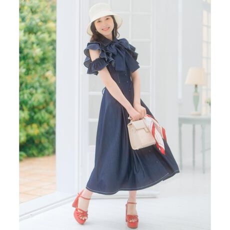 さっと着て、さっと決まる。毎日の主役ワンピース【Design】・フレアスリーブ風のラッフルフリルデザインにオフショル風のフリルをプラスした、フェミニンロングワンピース。・肩周りは甘めな雰囲気のフリル使いに、肌見せ感でヘルシーさもプラス♪・フロントボタン仕様のシャツワンピースデザインで、甘さの中にもきちんと感を兼ね備えた仕上がり。・ボウタイは取り外し可能で、気分やスタイルに合わせたアレンジが楽しめます。・ウエストにタックを入れて細見え効果を実現し、スタイルアップに貢献!・カラーはデニムライクなホワイトとネイビー、爽やかな印象のブルーストライプの3色展開。・オンオフ問わず幅広いシーンで活躍し、デイリーにも特別な日にもおすすめの一着です。【Fabric】・しなやかさのある生地を使用。・ブルーストライプはコットン混の生地を使用した軽い着心地。・程よいハリ感のある裏地付き。・ホワイト、ブルーストライプ、ネイビーの3色展開となります。【Care】ドライクリーニング