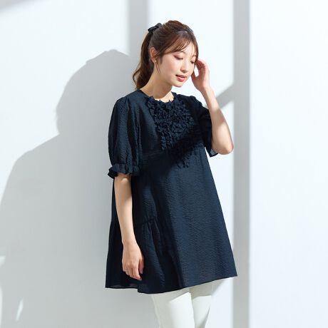 綿100のソフトな風合いとミラクルウェーブ加工によりポコポコとした凹凸が肌離れよく、速乾性もある、汗ばむ季節にも快適のチュニック丈ブラウス。