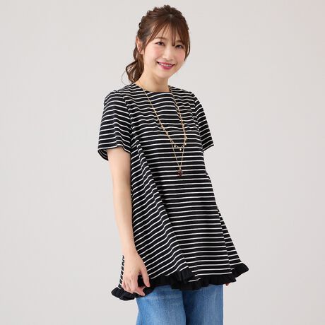 カジュアルなボーダー柄も細いラインなのですっきりと見え、裾の切替フリルがキュートなアクセントになったデザイン。