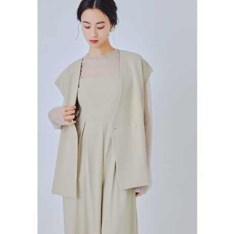 フレンチスリーブのノーカラーベストは羽織るだけでマニッシュな印象に。