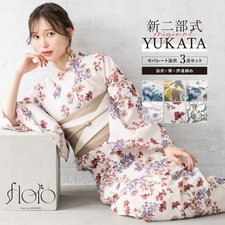 SOUBIENのプライベートブランド『floro by SOUBIEN』(フローロ)の浴衣を合わせた華やかな浴衣セットです。