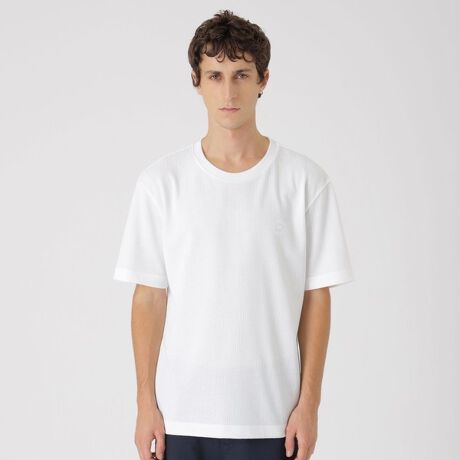 サッカー地を使用したTシャツ。生地の凹凸感により肌離れが良く、清涼感あるアイテムに仕上がっています。左胸にブランドのエンブレム刺繍を同色であしらう事でデザインアクセントに。