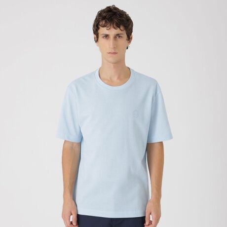 サッカー地を使用したTシャツ。生地の凹凸感により肌離れが良く、清涼感あるアイテムに仕上がっています。左胸にブランドのエンブレム刺繍を同色であしらう事でデザインアクセントに。