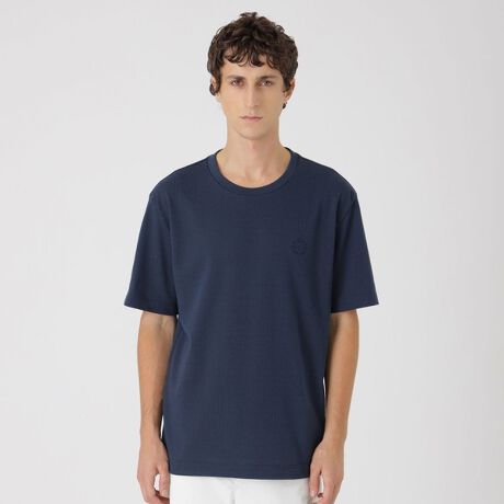 サッカー地を使用したTシャツ。生地の凹凸感により肌離れが良く、清涼感あるアイテムに仕上がっています。左胸にブランドのエンブレム刺繍を同色であしらう事でデザインアクセントに。