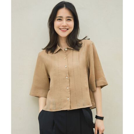 羽織りとしても活躍するゆったりシルエットのブラウス■デザインゆとりのあるシルエットと太めの袖がポイントの、クロップド丈ブラウスです。タックから生み出されるシアー素材の重なりが繊細な奥行きを感じられ、程よく華やかなブラウスになっています。ワイドパンツなどボリューム感のあるボトムを合わせて、今年らしいバランスのコーディネートもおすすめです。前を開けてワンピースなどに合わせて羽織りとしても着て頂けます。■素材ハリコシのあるラミーと柔らかいセルロース系再生繊維を混紡することにより、さらりとしたドライ感がありながらもしなやかさも兼ね備えた、程よいシアー感のある素材です。天然素材であるラミーの良さを生かしつつ、きれいめに仕上げているので、カジュアルになり過ぎず大人っぽさを感じられる素材感です。さらりとしたタッチの薄地で、接触冷感機能もあるので、暑い夏にもおすすめの素材です。麻高混率でありながらも鋭利なシワが付きにくく、洗いざらしでも程よいナチュラルさで着て頂けます。■同素材アイテムフリルブラウス(BLWMGA0105)イレギュラーヘムスリーブブラウス(BLWMGA6702)フレンチスリーブワンピース(OPWMGA0105)シャツワンピース(OPWMGA6702)