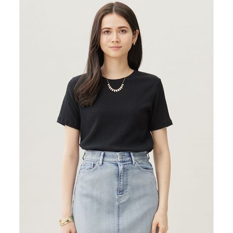 素材の表情感がコーディネートに華やかさをプラスするTシャツ■デザイン素材に凹凸があるのがポイントのTシャツです。気温が高まるにつれてフラットになりがちなスタイリングに華やかさをプラスしてくれるユニークな素材のアイテムです。シルエットはややコンパクトで、すっきりと仕上げており、インでもアウトでも着て頂けます。■素材程よい光沢感とカジュアル感をブレンドしたランダムシャーリングレースです。特殊な編み機を使用することでシャーリング加工を施し、心地よいストレッチと鮮度を表現しました。伸縮性もあるので、快適な着心地感もポイントです。