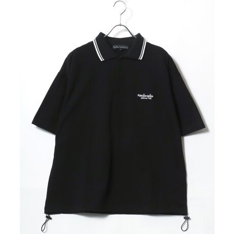 トレンドのドローコード付きで絞り調整のできるストリート、スケーター、アメカジテイストの襟ラインワンポイント刺繍ポロシャツ。
