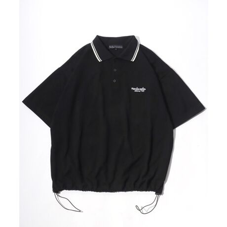 トレンドのドローコード付きで絞り調整のできるストリート、スケーター、アメカジテイストの襟ラインワンポイント刺繍ポロシャツ。