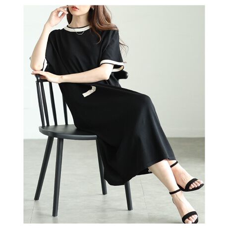 【ワンピース】 サマーニット ライン 配色 半袖 ミモレ丈 フェイクポケット ブラック オフホワイト
