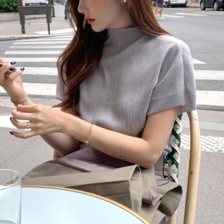 ネックラインが首元をすっきり見せ、大人っぽさも演出します。<br>