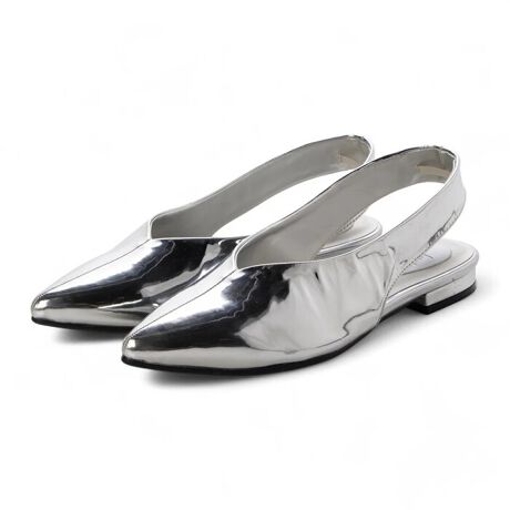 洗練された光沢が目を引く、メタリックシルバーのポインテッドトゥシューズ。華奢なシルエットとスリングバックデザインで、足元に抜け感とエレガンスをプラスします。クッション性のあるインソールとフラットヒールで、見た目の美しさと履き心地を両立。カジュアルからフォーマルまで幅広いコーディネートに活躍する一足です。