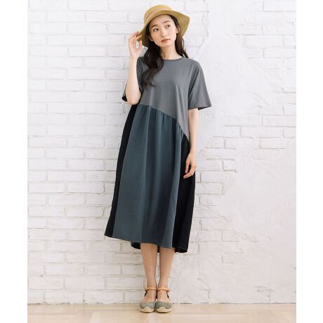 21号(6L〜) 異素材コンビカラーブロックワンピース