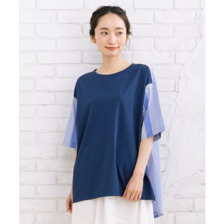 フロントはシンプルな無地Tシャツ、袖と後ろ身頃には爽やかなストライプ柄シャツ生地を組み合わせ、レイヤード風の仕上がりに。