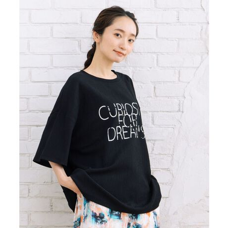 メッセージロゴが目を引く、遊び心のあるプリントTシャツ。