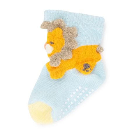 立体的なデザインが目を引く『エービーシーズー』のライオン型靴下です。背面に後ろ足としっぽをあしらっているのもポイント。ライオンのかわいい表情や肉球など、細部にまでこだわった仕上がりです。ペールブルーの淡いベースカラーが優しい雰囲気に。足裏にはすべり止めが付き、歩き始めたばかりのお子さまも安心して着用できます。