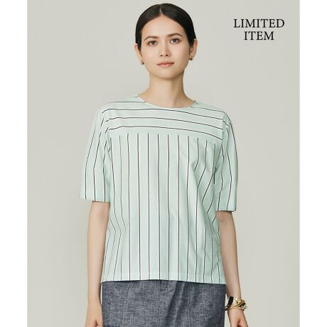 ストライプ柄が爽やかで暑い夏におすすめのカットソー■デザインストライプの柄を活かした縦横の切り替えがキャッチーな、ブラウスライクなカットソーです。袖のフォルムがアクセントになっています。シンプルなデザインで、パンツやスカートなど合わせるボトムを選ばないので、着て頂きやすいアイテムです。■素材46ゲージの希少なハイゲージ機で編み立てたキレイめな印象のジャージー素材です。肌離れのよい盛夏向けの素材です。