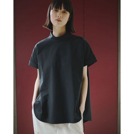 薄手でドライタッチのポリエステルを使ったハイネックブラウスです。