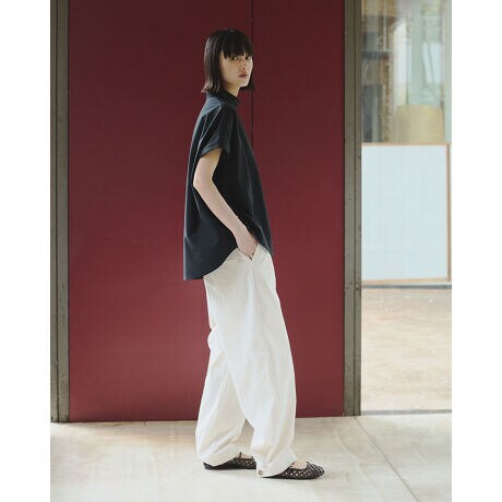 ウエストゴム使いでワイド目シルエット仕上げ。