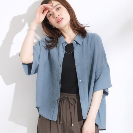 光沢感のあるワッシャー素材で、しぼしぼとした表面感のシャツです。