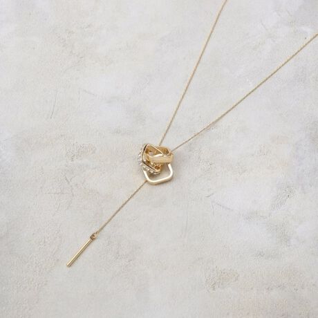 やわらかいシェイプのスクエアメタルパーツに、ビジューをデザインしたリングを3つ重ねたネックレス。
