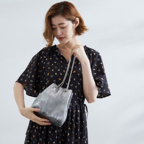 キラキラ素材やプリーツ素材を使用したトレンドの巾着デザインのチェーンミニショルダーバッグです。
