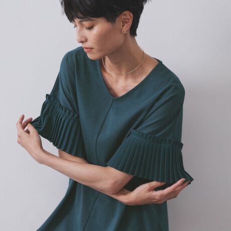 ・お袖に別素材のプリーツデザインをドッキングした、きれいめに着られるカットソープルオーバー。
