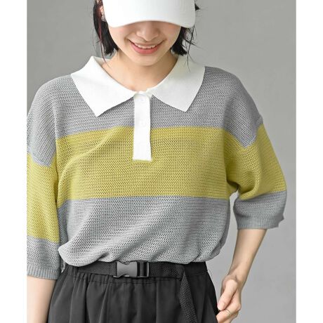 白いポロ襟が顔周りを明るい印象に仕上げてくれます。