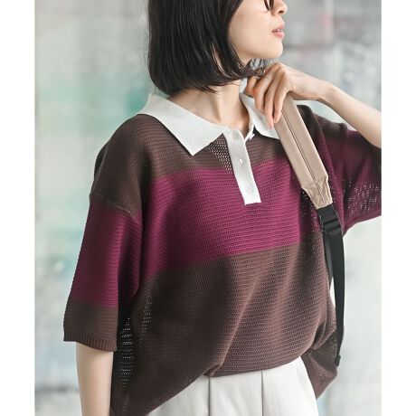 白いポロ襟が顔周りを明るい印象に仕上げてくれます。
