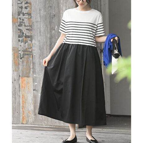 ボーダートップスとスカートのスタイリングが着るだけで完成するドッキングワンピース。