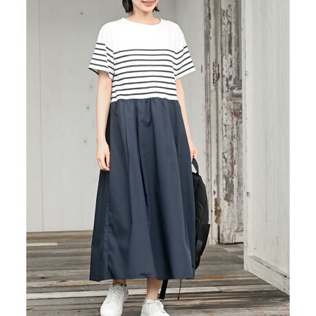 ボーダートップスとスカートのスタイリングが着るだけで完成するドッキングワンピース。