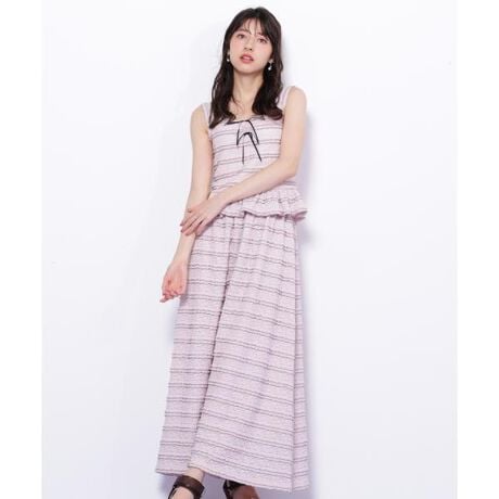 バイカラーのラインが効いたフリルレースのトップスとスカートのセットアップ。ストレッチレースで動きやすく、涼しげで肌離れも良い素材を使用しています。ペプラムデザインのトップスは、単品使いでパンツとの着回しも可能。スカートのウエストはゴム仕様でラクなはき心地です。また、ウエストには微光沢素材を使っているため、単品で使う時にもウエストがすっきり見えるデザインです。※撮影時照明の関係により、色味が違って見える場合がございます。またパソコン・スマートフォンなどの環境により、若干製品と画像のカラーが異なる場合もございます。予めご了承ください。商品の色味は、商品単品画像をご参照下さい。※商品画像はサンプルのため、色味やサイズ等の仕様に変更がある場合がございますので、予めご了承ください。