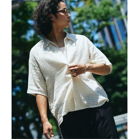 通気性に優れたシアー感のある素材が、肌離れのよい快適な着心地を提供。やわらかな透け感が、春夏らしい抜け感と涼感を演出します。さらに、製品洗いを施すことで表面に自然なシワと立体感をプラスし、ナチュラルでクラフト感のある風合いに仕上げました。