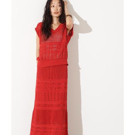 ざっくりとした透かし編みのニットベストとスカートのセットアイテム。パッチワークのように横段で切り替え、複数の柄編みをした高見えするデザインです。スカートの裾にはフリンジを入れてこなれ感を演出。ウエストはゴムが入っているのではき心地が良いです。それぞれ単品でも使いやすいデザインです。大人っぽい黒のほかに、華やかなレッドは着映えし、旅行などにもおすすめです。<素材>ややスラブ感のある涼しげなタッチの糸を使用。太めの糸でざっくりと編んだカジュアル感のある素材です。<詳細>仕様・開閉なし裏地・ニットはなし、スカートはあり透け感・ニットはあり、スカートはなし / 光沢・なし / 伸縮性・あり 生地の厚さ・普通※モデルの着用画像の場合、光の当たり具合により、実際の色味と異なって見えることがございます。