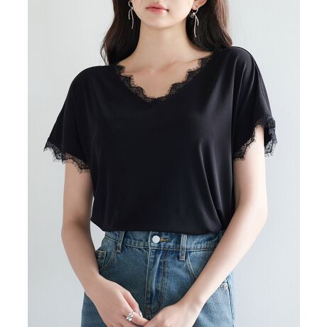 ネック部分と袖口部分にはレースがあしらわれています。シンプルなTシャツにさりげなくエレガントな要素を取り入れたデザインです。