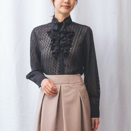 首元のフリルが華やかなムードを演出する長袖ブラウス。表面感のあるカットジャガード生地を使用し、女性らしさを際立たせています。上品で落ち着いた印象のハイネックがポイント。生地には透け感があるため、軽やかな着心地を演出します。スカートと合わせたレディライクなコーディネートがおすすめです。休日のお出かけやお呼ばれシーンにも活躍してくれます。