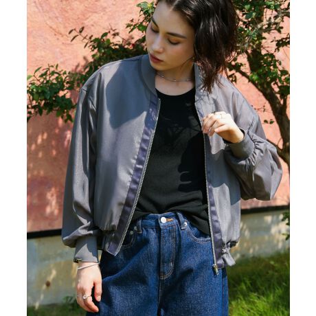 シャイニー感のあるシアー素材の1枚で着映えするブルゾン。シアー素材が今のムードにぴったりで、ノースリーブや半袖にカーディガン感覚で合わせて◎ 残暑が続く今の季節にさらっと羽織れる軽アウターです。身頃の裏地をあえてのメッシュ配色しているので、ちらりと見える感じもかわいく抜け感を出してくれます。