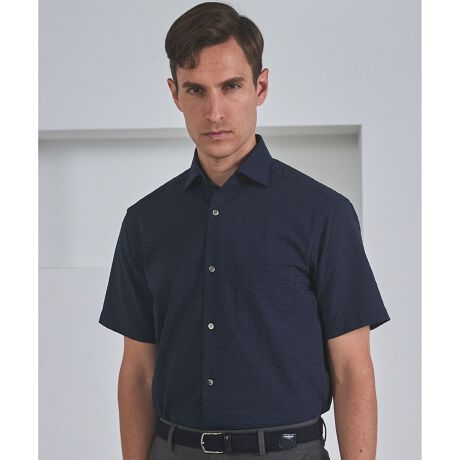 ■商品特徴クールビズの時に一枚で出来る仕事着に加え、普段使いもできるサッカー地のビジカジシャツです。軽量且つドライタッチで汗がベタつきにくくなっており、暑い夏場でも涼しく着用いただけます。家庭洗濯可能でシワがつきにくく、そのままでも着ることができるお手軽さも魅力的。 ビジネスシーンにもなじむ色柄を使用しており、大人の夏の半袖シャツに最適です。
