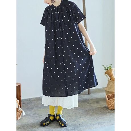 小さなドット刺しゅうで愛らしいアクセントをプラスするシャツワンピース。