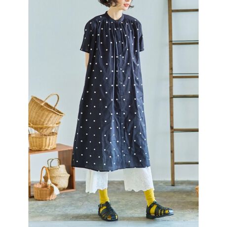 小さなドット刺しゅうで愛らしいアクセントをプラスするシャツワンピース。