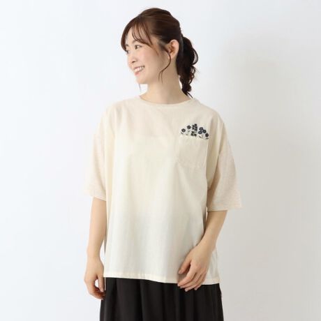 コットン天竺 花刺繍入り5分袖プルオーバー