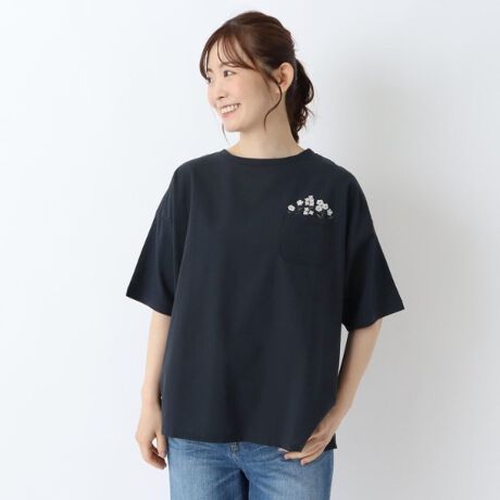 コットン天竺 花刺繍入り5分袖プルオーバー