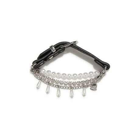 レザーブレスレットに、部分的にパールやクリスタルなどの装飾を施しフェミニンに仕上げたアイテム。ロゴをあしらったリボンチャームや雫型のパールを下げたデザインもポイントです。バックルが付いた仕様となっているためサイズ調節が出来るようになっております。