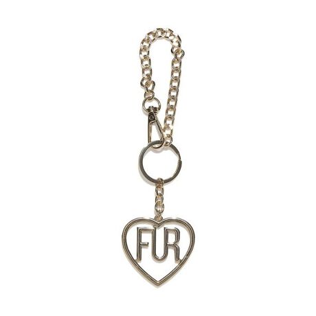 大きいハートの中にブランドロゴをデザインしたバッグチャーム。様々なアイテムに下げられるよう、チェーンを下げた仕様にしております。