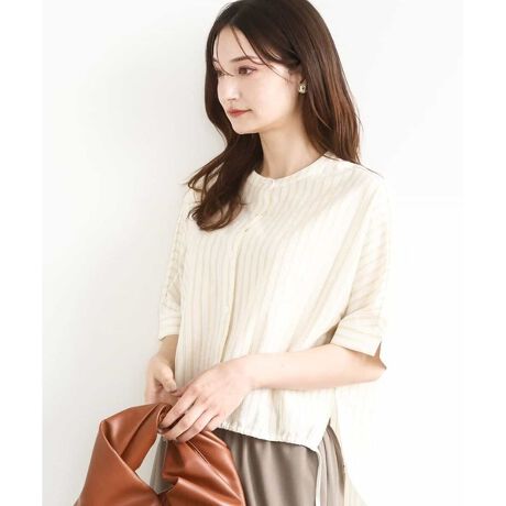 細めのストライプが大人っぽいバンドカラーのドルマンスリーブカットソー。裾のドロストデザインはそのままコードを垂らしても、くしゅくしゅっとさせてもアクセントにし。脇にスリットの入った前後差の着丈が一枚でも着映えるニュアンス感たっぷりの着こなしに。ベースのカラーがイエローはベージュ地に、ネイビーはホワイト地になります。