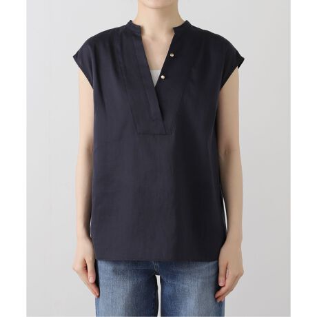 ナチュラルな風合いが魅力のリネン混素材を使用した、清涼感あふれるノースリーブブラウス。